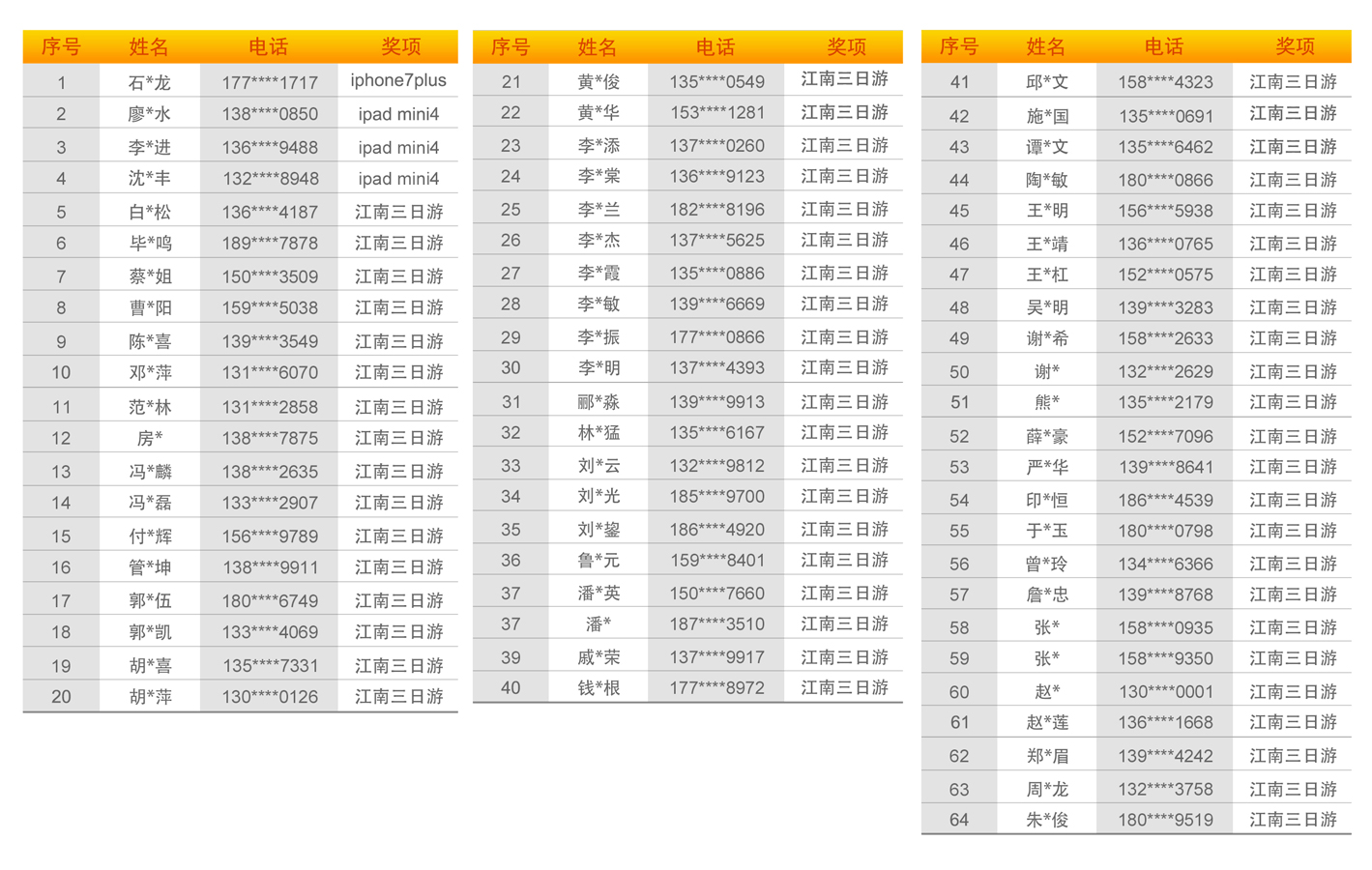 截止9月30日,瑪吉斯輪胎為消費者量身定制此次“江南游”活動也迎來了尾聲,經(jīng)后臺統(tǒng)計共計3455人參加,其中有效參與達2000余人。十一黃金周過后,工作人員也于系統(tǒng)后臺公平公正抽選出特等獎60名、一等獎1名、二等獎3名及幸運獎100名,現(xiàn)公布獲獎名單如下: