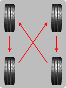 如果輪胎的磨損情況嚴重,建議使用如圖的方式交換前后輪胎,這樣可以使得所有輪胎保持大致相同的損耗。